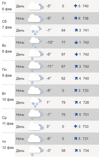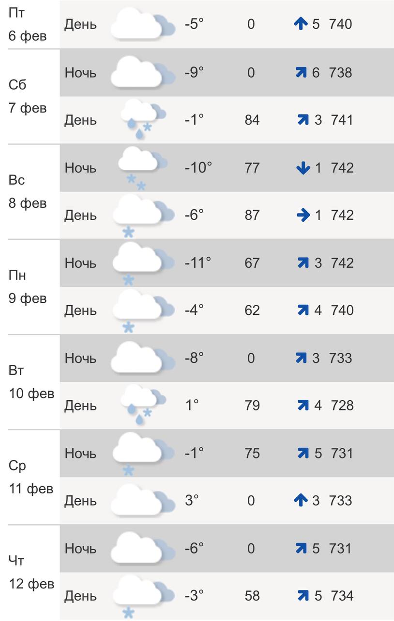 В субботу, 7 февраля, днем ожидается -1°C. Облачно, небольшие осадки. Ветер юго-западный 3 м/с. В ночное время – до -10°C.Облачно, без осадков. Ветер южный 5 м/с. Ночью – до -9°C.
