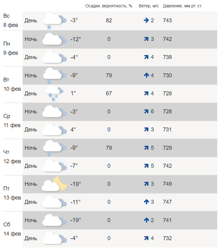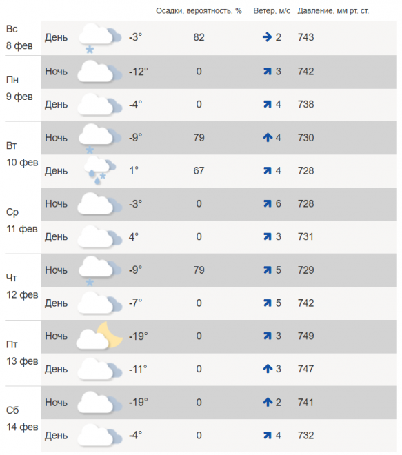 В четверг, 12 февраля, днем – до -7°C. Облачно, без осадков. Ночью будет -19°C.