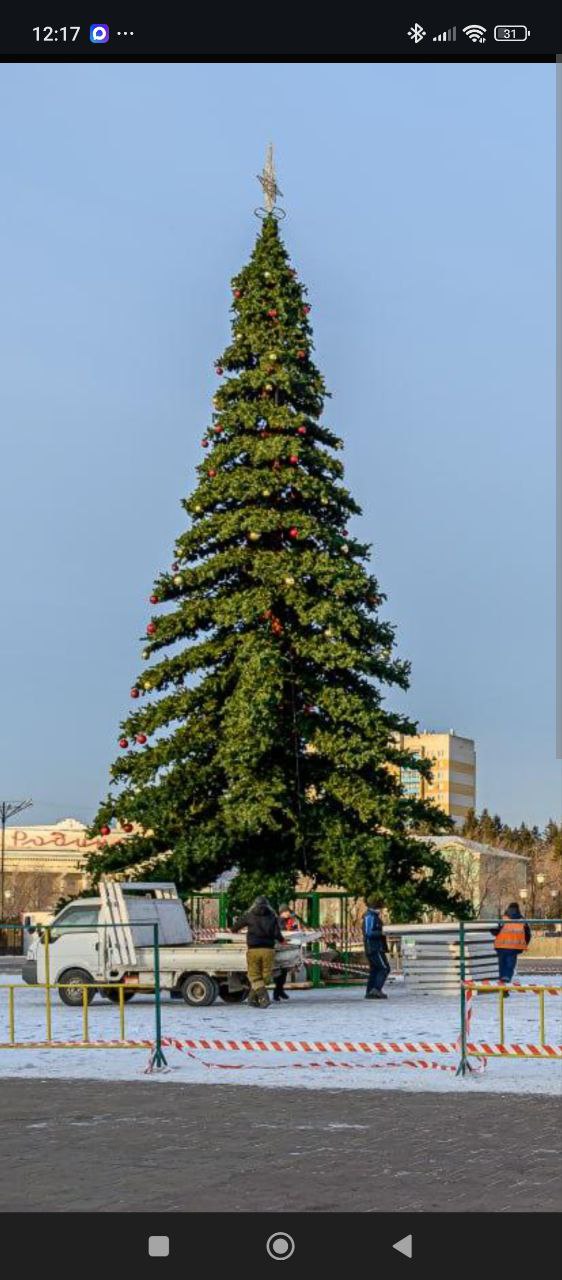 «В Чите (Забайкалье) поставили такую ёлку. Искусственная, но смотрится шикарно. И веточки и иголочки и украшают её большими шарами. Вот бы нам такую. В темноте время суток светится красиво»
