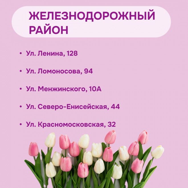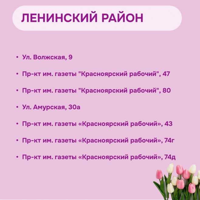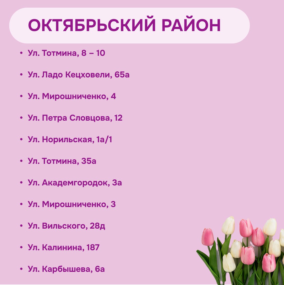 Почти 60 локаций с цветами будут доступны для красноярцев в преддверии Международного женского дня. В мэрии напомнили, что продавать тюльпаны можно только в разрешенных точках, а иначе – предпринимателей ждет штраф вплоть до 10 тысяч рублей.