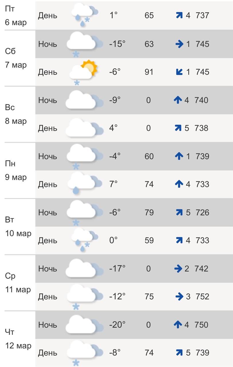 В понедельник, 9 марта, прогнозируется +7°C днем и -6°C ночью. Синоптики обещают снег с дождем. Ветер южный 4 м/с.