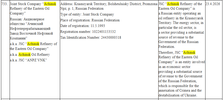 Ачинский НПЗ попал под европейские санкции. Какие еще компании и личности в списке?