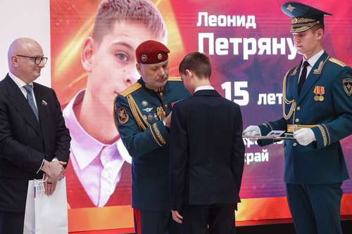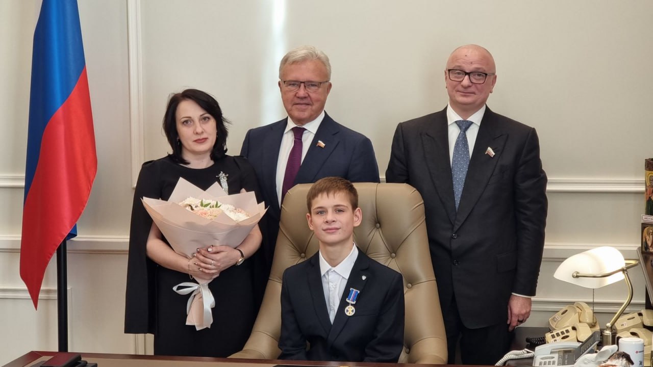 Председатель Совфеда Валентина Матвиенко и министр по делам ГО и ЧС Александр Куренков вручили 15-летнему подростку медаль «За проявленное мужество».