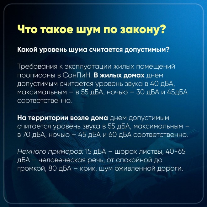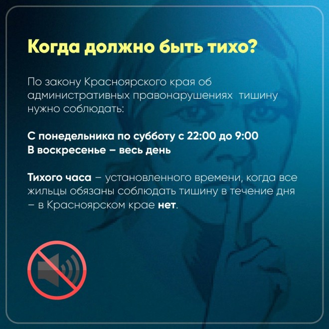 Отдохнуть в квартире в тишине – не привилегия, а право, которое предусматривают санитарные правила и нормы. Их подкрепляет законодательство – оно гарантирует часы тишины, когда в доме и за его пределами шуметь нельзя, но не все соседи соблюдают эти правила. В какое время в домах Красноярского края должно быть тихо и куда пожаловаться на шум? Об этом в карточках ТВК.