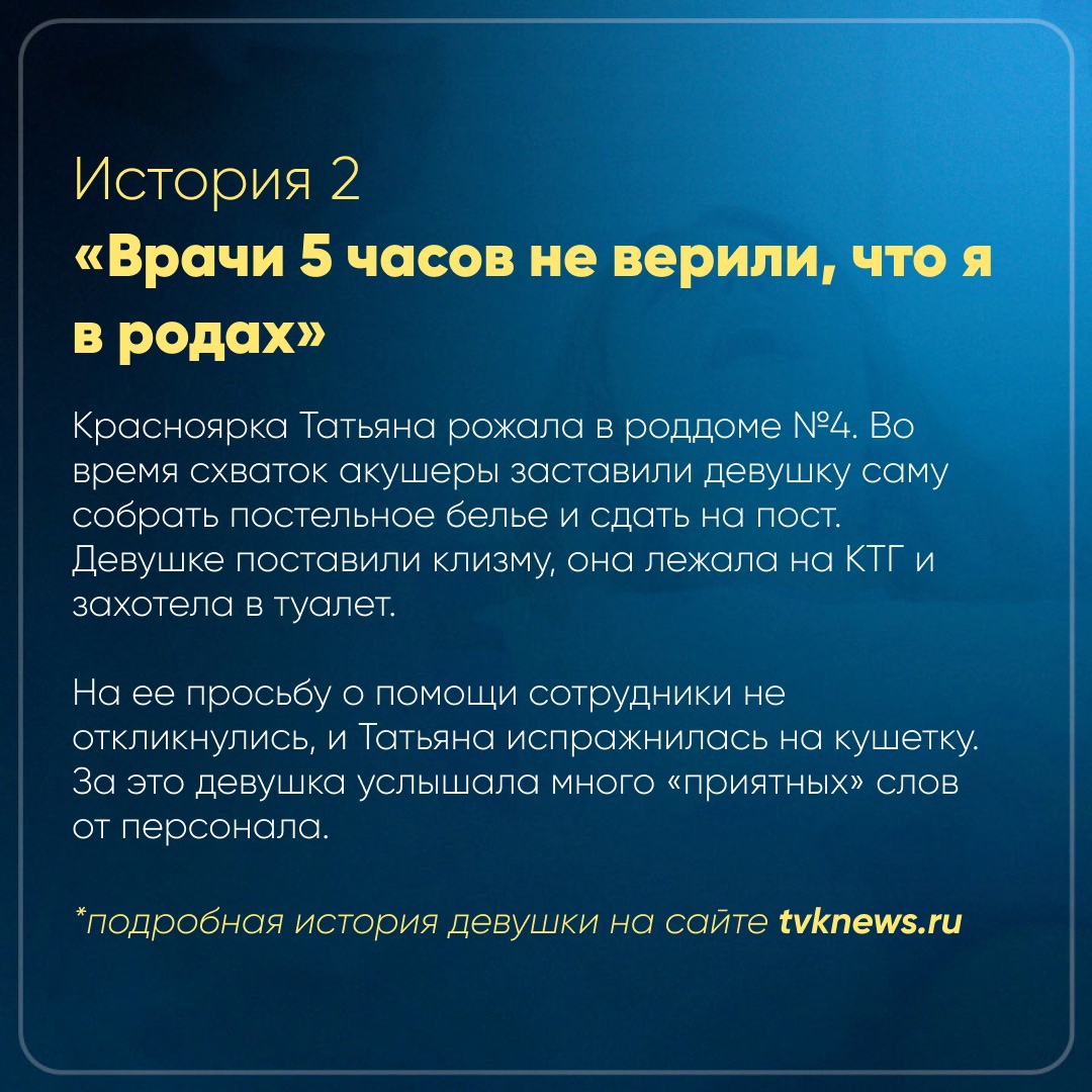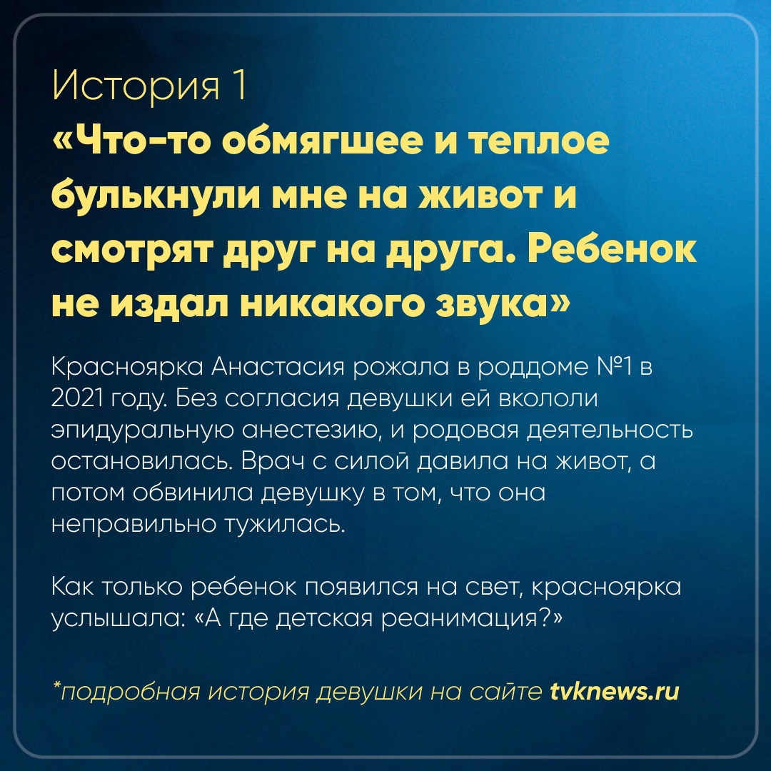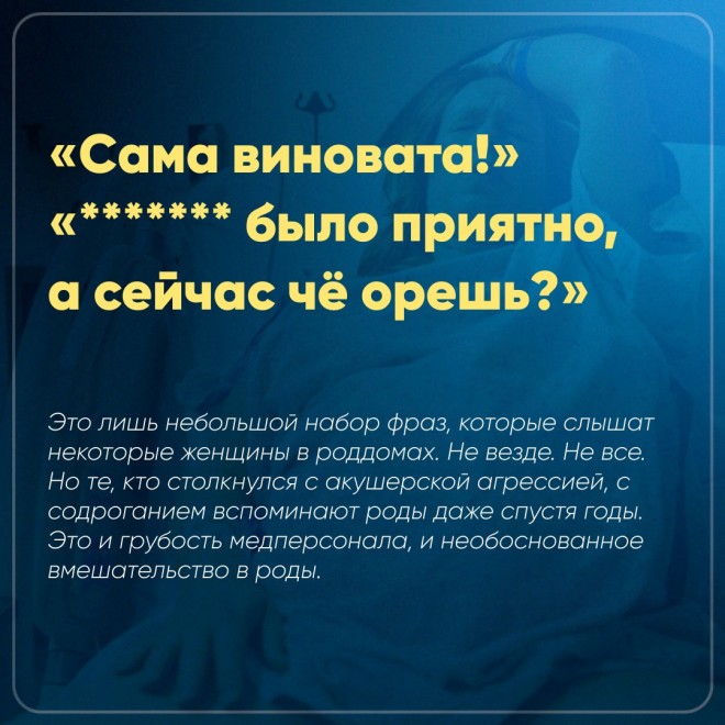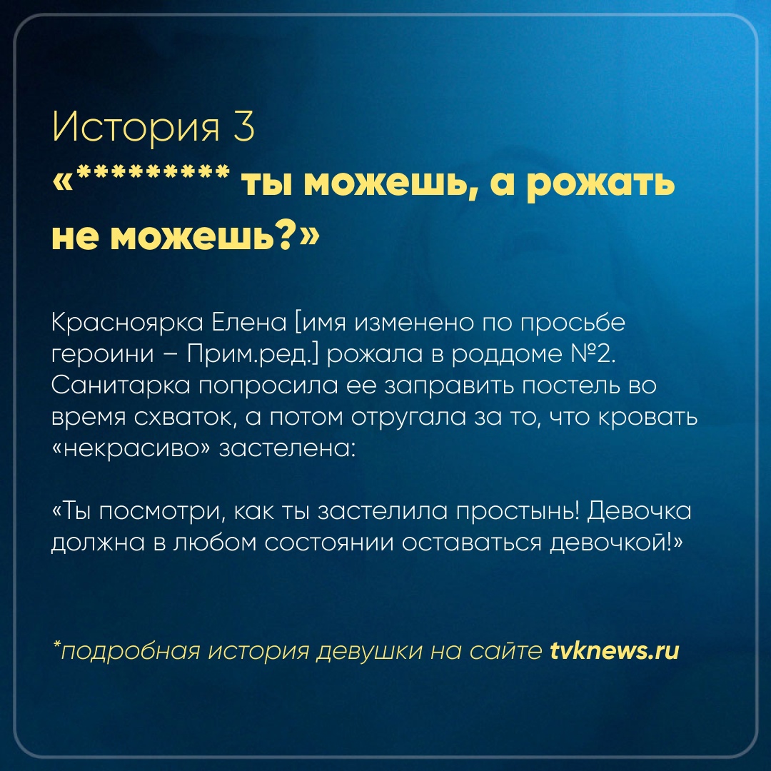 Сама виновата!», «******* было приятно, а сейчас чё орешь?» – это лишь небольшой набор фраз, которые слышат некоторые женщины в роддомах. Не везде. Не все. Но те, кто столкнулся с акушерской агрессией, с содроганием вспоминают роды даже спустя годы. Это и грубость медперсонала, и необоснованное вмешательство в роды. ТВК пообщались с красноярками, которые столкнулись с акушерской агрессией. Как это влияет на женщин с психологической точки зрения? Знают ли главврачи красноярских роддомов об акушерской агрессии и как планируют решать проблему? Куда жаловаться, если вас оскорбила акушер? Можно ли привлечь медиков к ответственности за грубое отношение? Ответы на эти вопросы – в карточках ТВК.