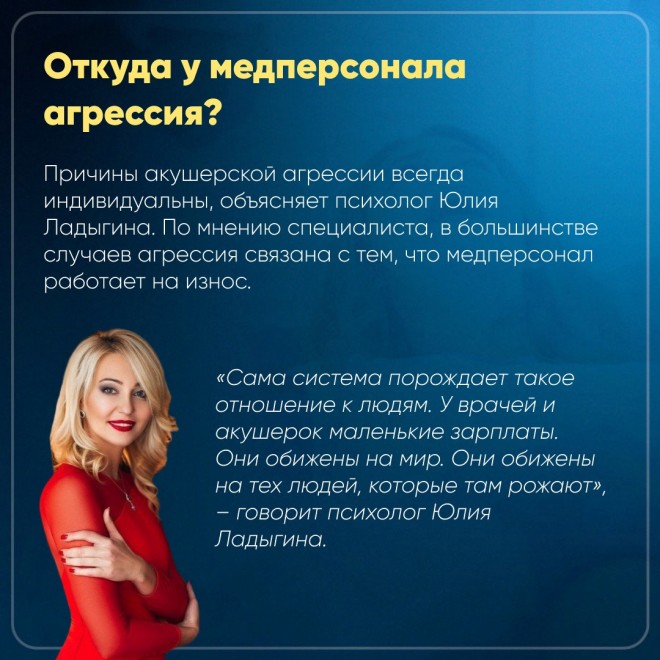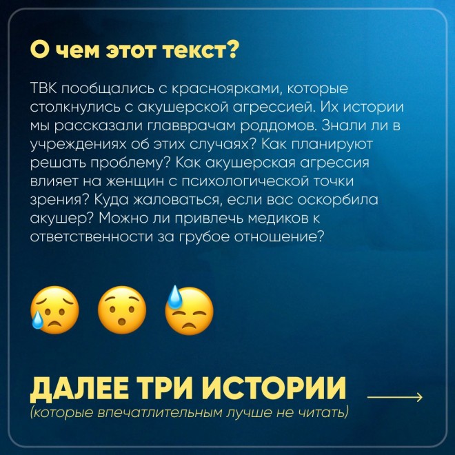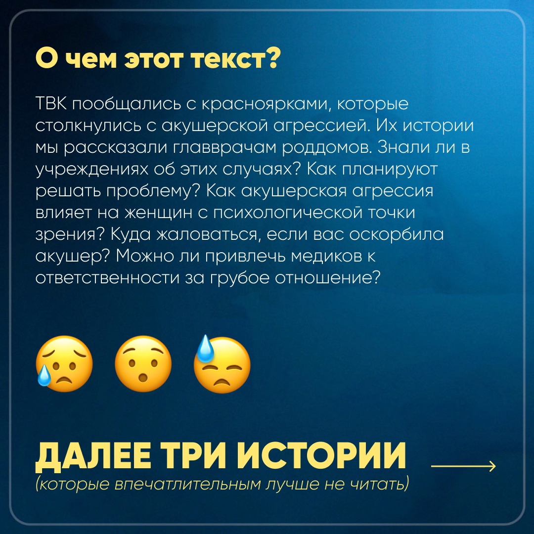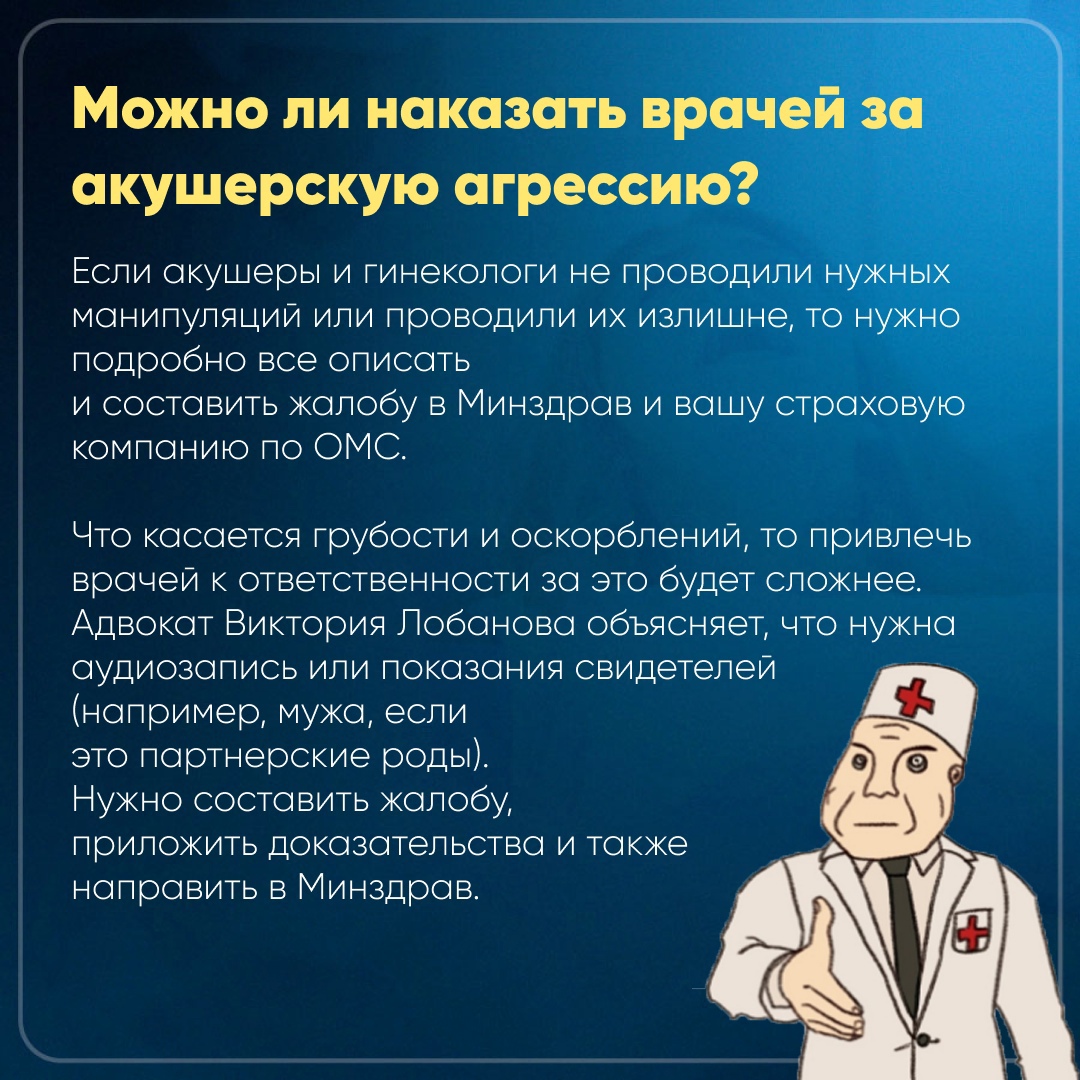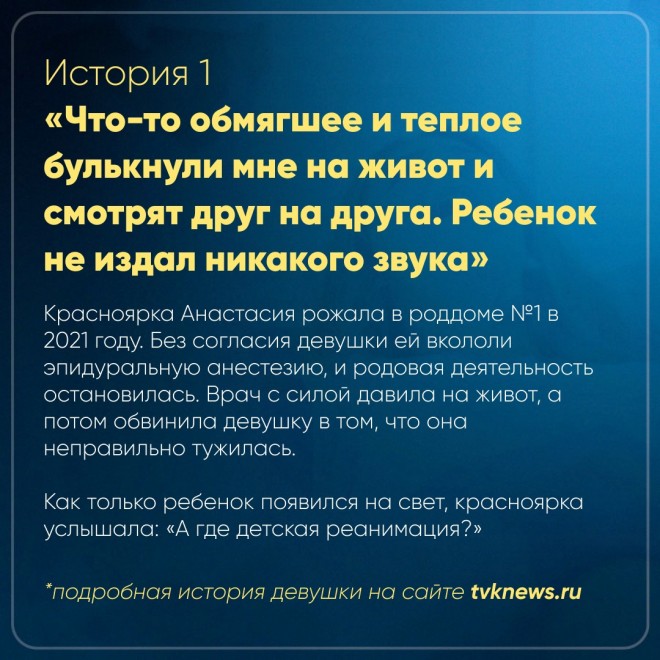 Сама виновата!», «******* было приятно, а сейчас чё орешь?» – это лишь небольшой набор фраз, которые слышат некоторые женщины в роддомах. Не везде. Не все. Но те, кто столкнулся с акушерской агрессией, с содроганием вспоминают роды даже спустя годы. Это и грубость медперсонала, и необоснованное вмешательство в роды. ТВК пообщались с красноярками, которые столкнулись с акушерской агрессией. Как это влияет на женщин с психологической точки зрения? Знают ли главврачи красноярских роддомов об акушерской агрессии и как планируют решать проблему? Куда жаловаться, если вас оскорбила акушер? Можно ли привлечь медиков к ответственности за грубое отношение? Ответы на эти вопросы – в карточках ТВК.