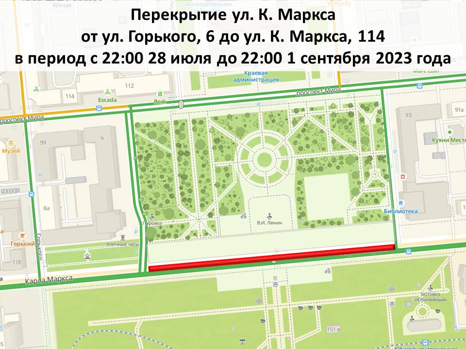 С 28 июля левую полосу движения перекроют от здания РЖД до краевой библиотеки. По плану ограничения продлятся до 1 сентября включительно. Это необходимо для безопасности автомобилистов.