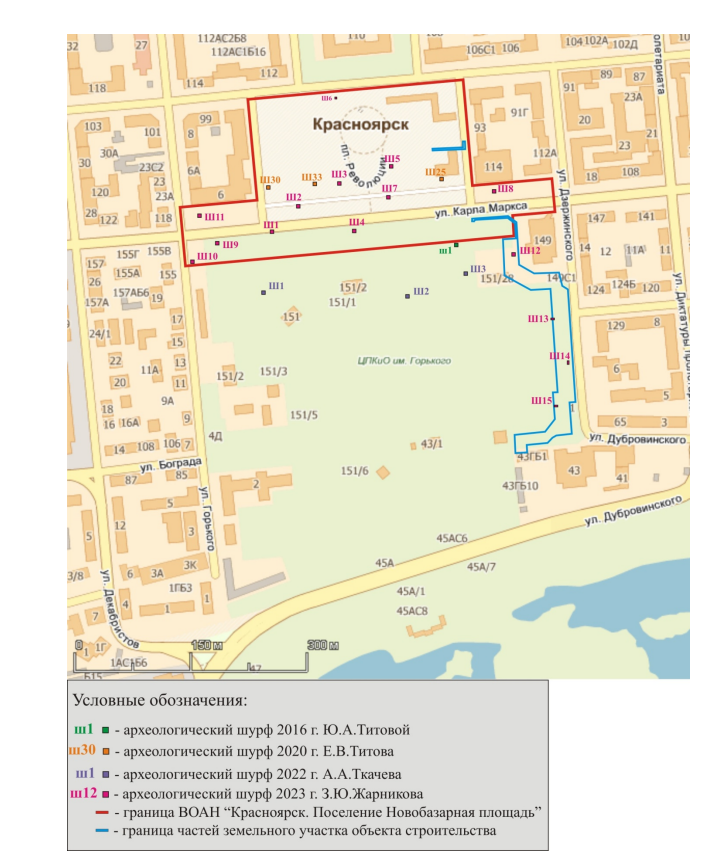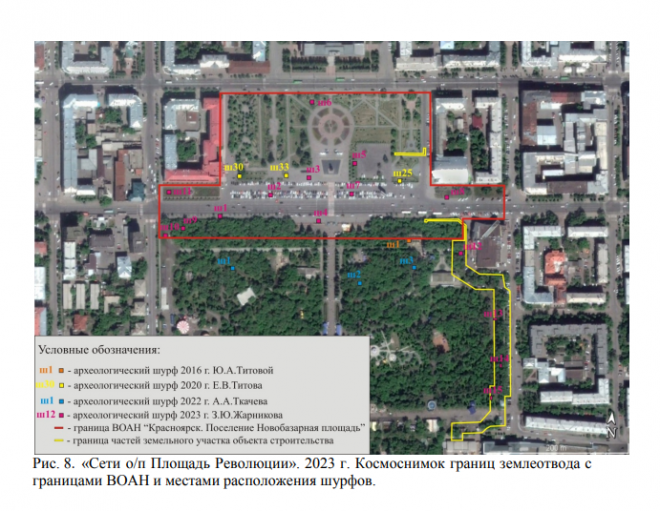 Речь идет об археологическом памятнике «Красноярск. Поселение Новобазарная площадь». У него несколько культурных слоев, один из которых датируется мезолитом-неолитом (примерно 8-4 век до н. э.). Также археологи сообщают о ценных находках на месте памятника – это бронзовая пряжка с гербом и надпись «СС ЖД», которую выпускали для рабочих-строителей Средне-Сибирской железной дороги, фрагменты фарфоровой, стеклянной и глазурованной посуды, кости животных и другое.