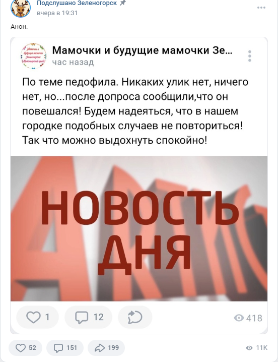 «Подойдя к задней двери машины, я увидела, как это животное лезет в памперс к моей годовалой дочери! Оттягивая его и лосины, чтобы залезть ниже! Конечно, я кинулась на него, оттащила от дочери, начала его бить и кричать. Товарищи, которые уже зашли за угол, услышали мои крики и примчались на них, с моих криков суть они поняли, и хотели его как-то задержать, но водитель залетел в машину, не закрыв дверь, умчался!», – написала девушка в сообществе «Подслушано в Зеленогорске»В комментариях к посту многие поддержали женщину. В соцсети выложили и фото таксиста. По словам местных, это не первый случай домогательств именно этого мужчины, но в полицию заявление писали не все.