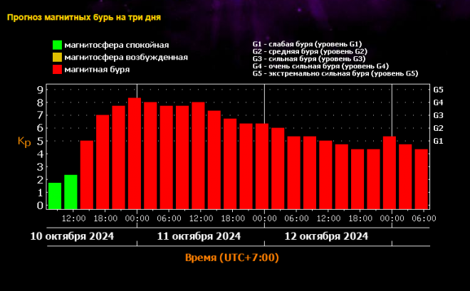 Уровень магнитосферы начнет подниматься ближе к вечеру 10 октября. Самая сильная волна ждет красноярцев в ночь на 11 октября. Тогда уровень будет чуть выше G4 – «очень сильной бури».