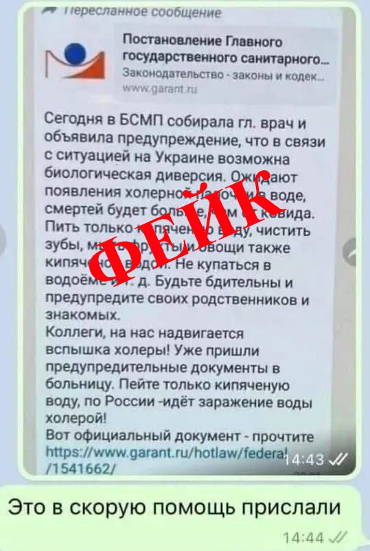 Автор фейкового сообщения заверяет, что в БСМП главврач якобы собрала людей и предупредила о диверсии. В тексте говорится, что вспышка холеры якобы надвигается. Людей призывают пить только кипяченую воду.