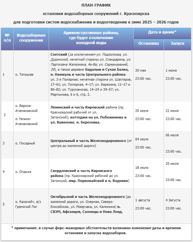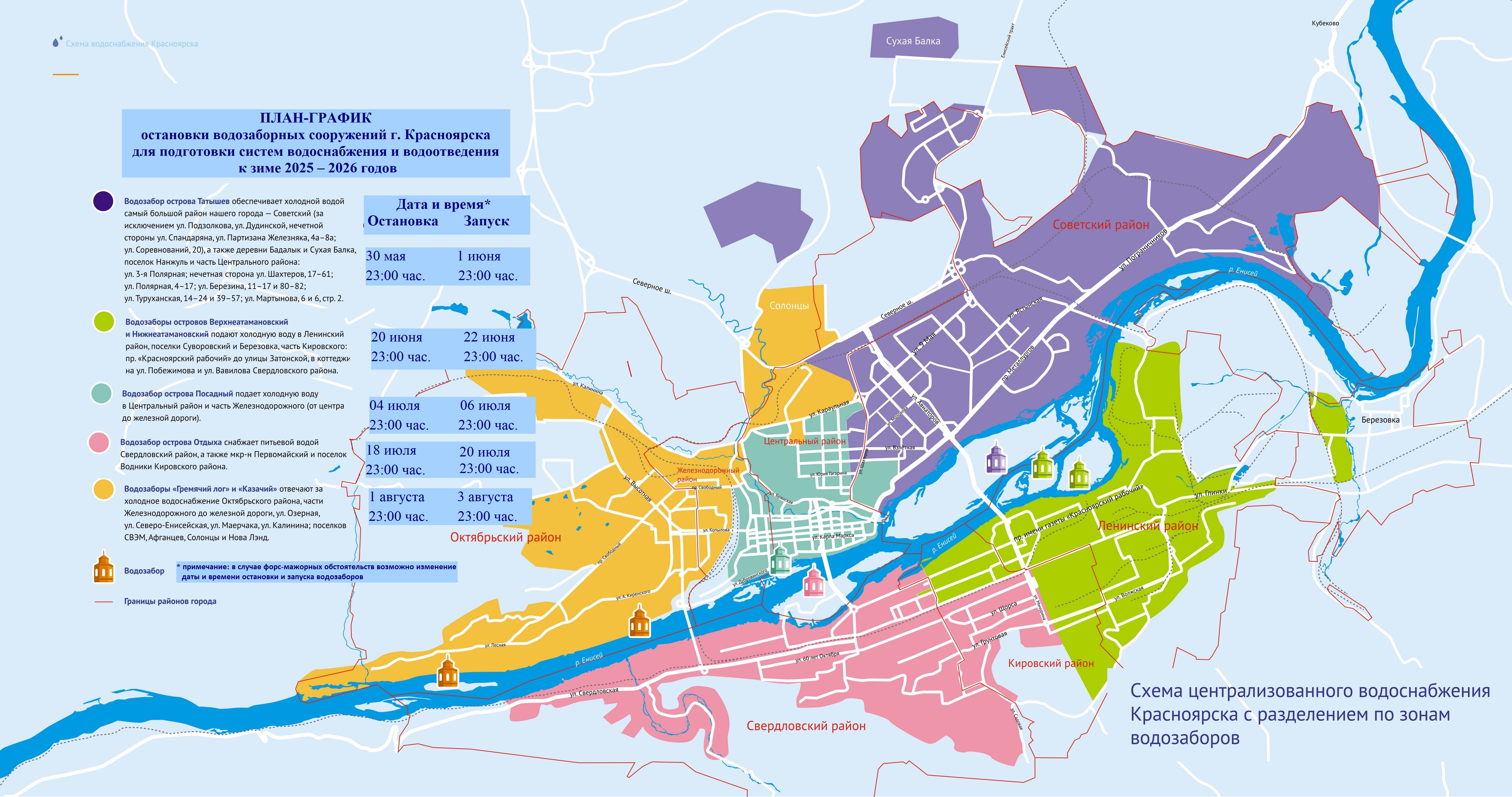 - С 23:00 1 августа до 23:00 3 августа без холодной воды окажутся Октябрьский район и часть Железнодорожного (до железной дороги, Озерная, Северо-Енисейская, Маерчака, Калинина) поселки СВЭМ, Афганцев, Солонцы и Новалэнд.