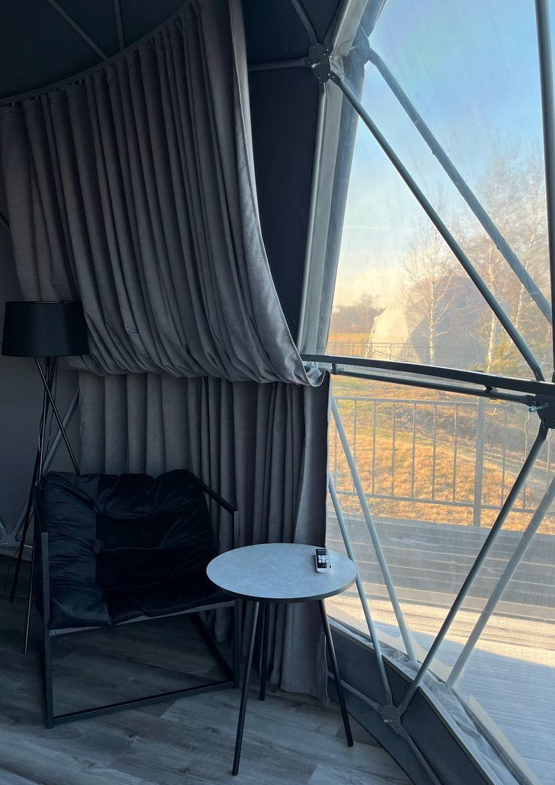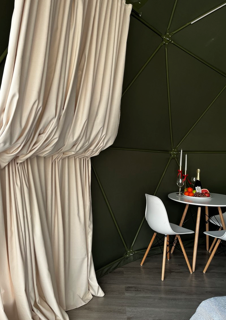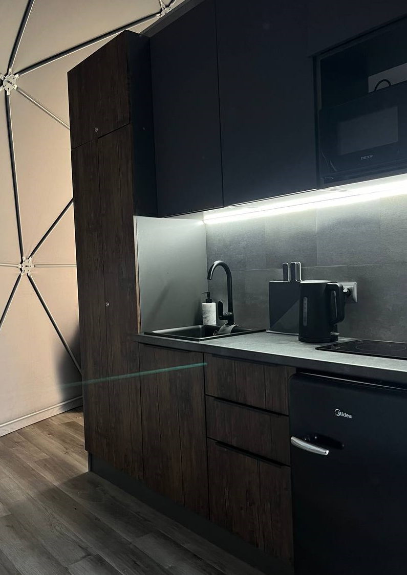 В геокуполе есть обувница, шкаф, обеденный стул и 4 стула, на кухне – вся посуда и техника (индукционная плита, холодильник, микроволновая печь, электрический чайник, сковорода, кастрюли, бокалы, рюмки, салатники и полный комплект посуды на 6 персон и принадлежностей). Чай, кофе и специи на кухне всегда есть.