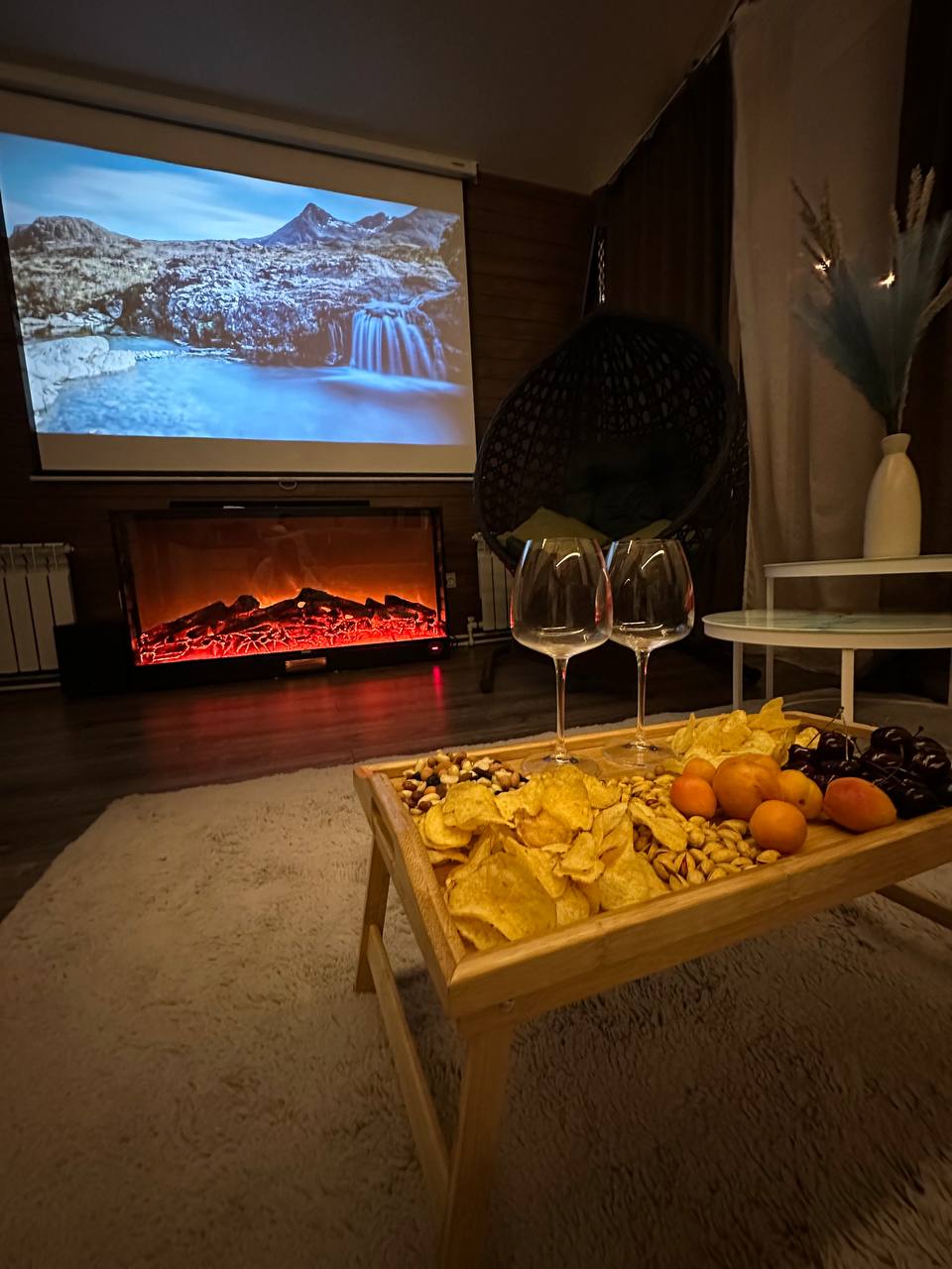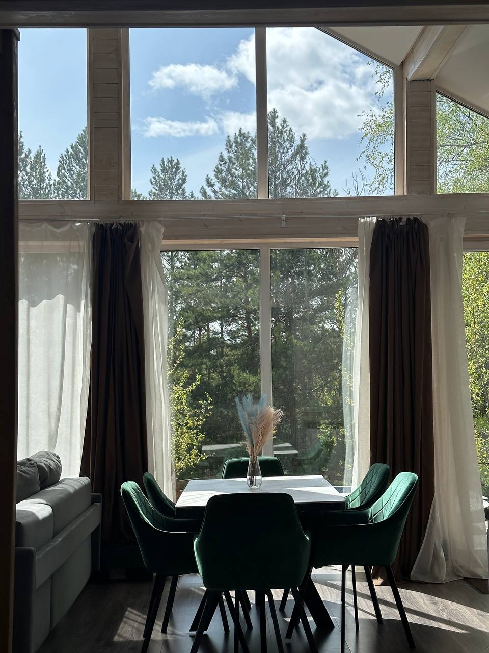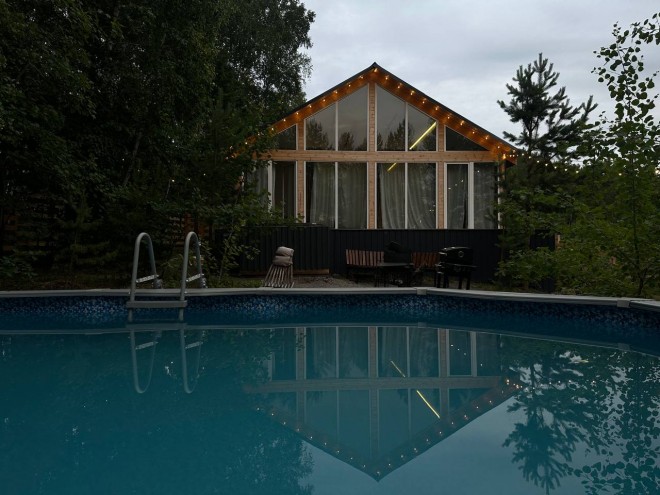 В доме теплый пол, большое панорамное окно, блэкаут шторы. Также есть проектор, подключен WI-FI. Большая кровать на первом этаже и еще одна двухспальная кровать на втором ярусе с ортопедическим матрасом и постельным премиум-класса. Для гостей в доме приготовили настольные игры.