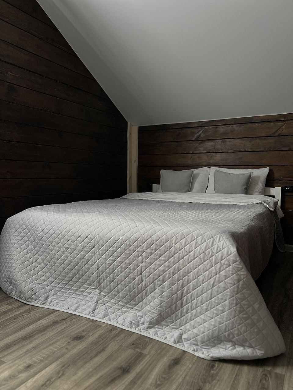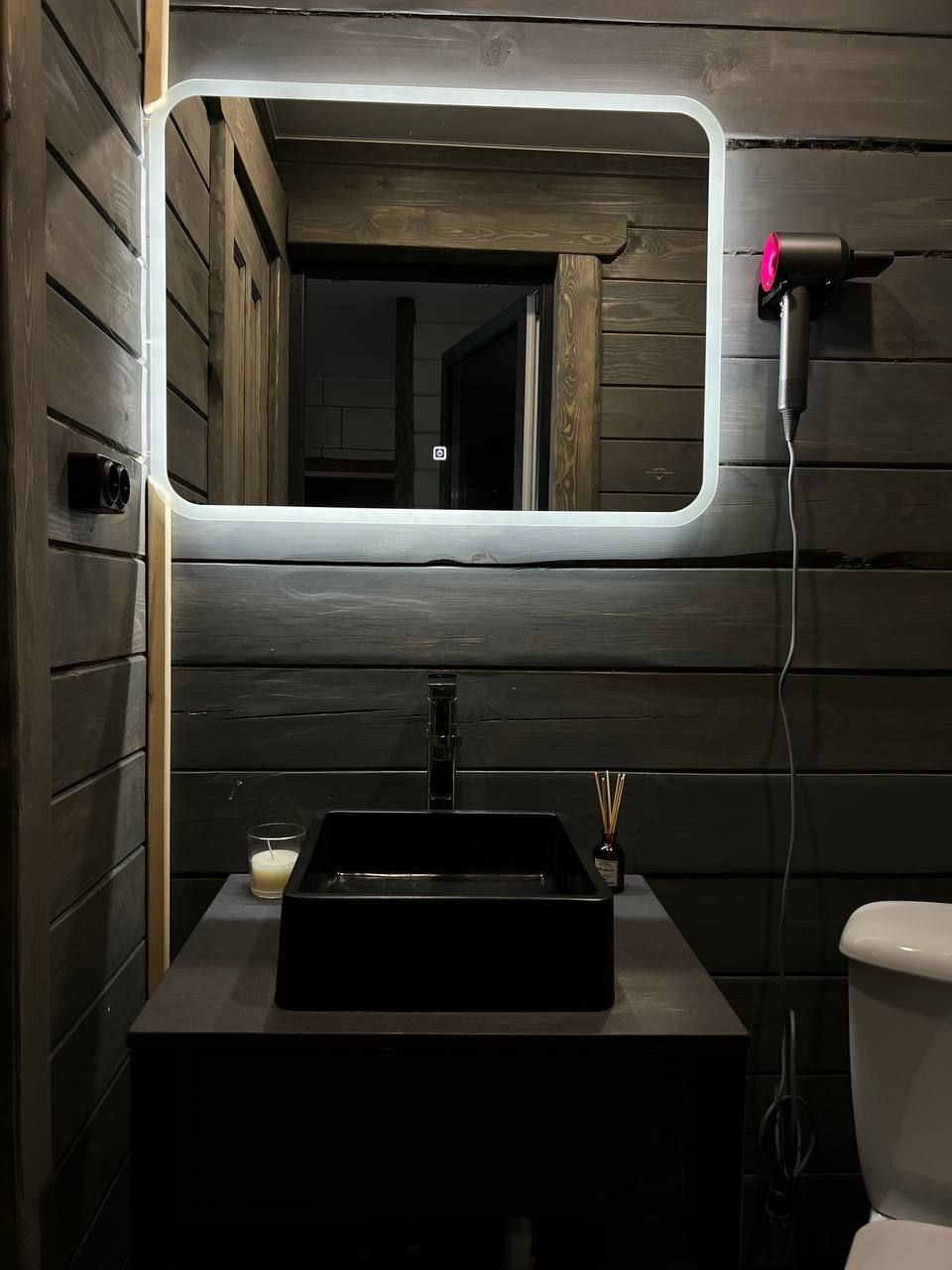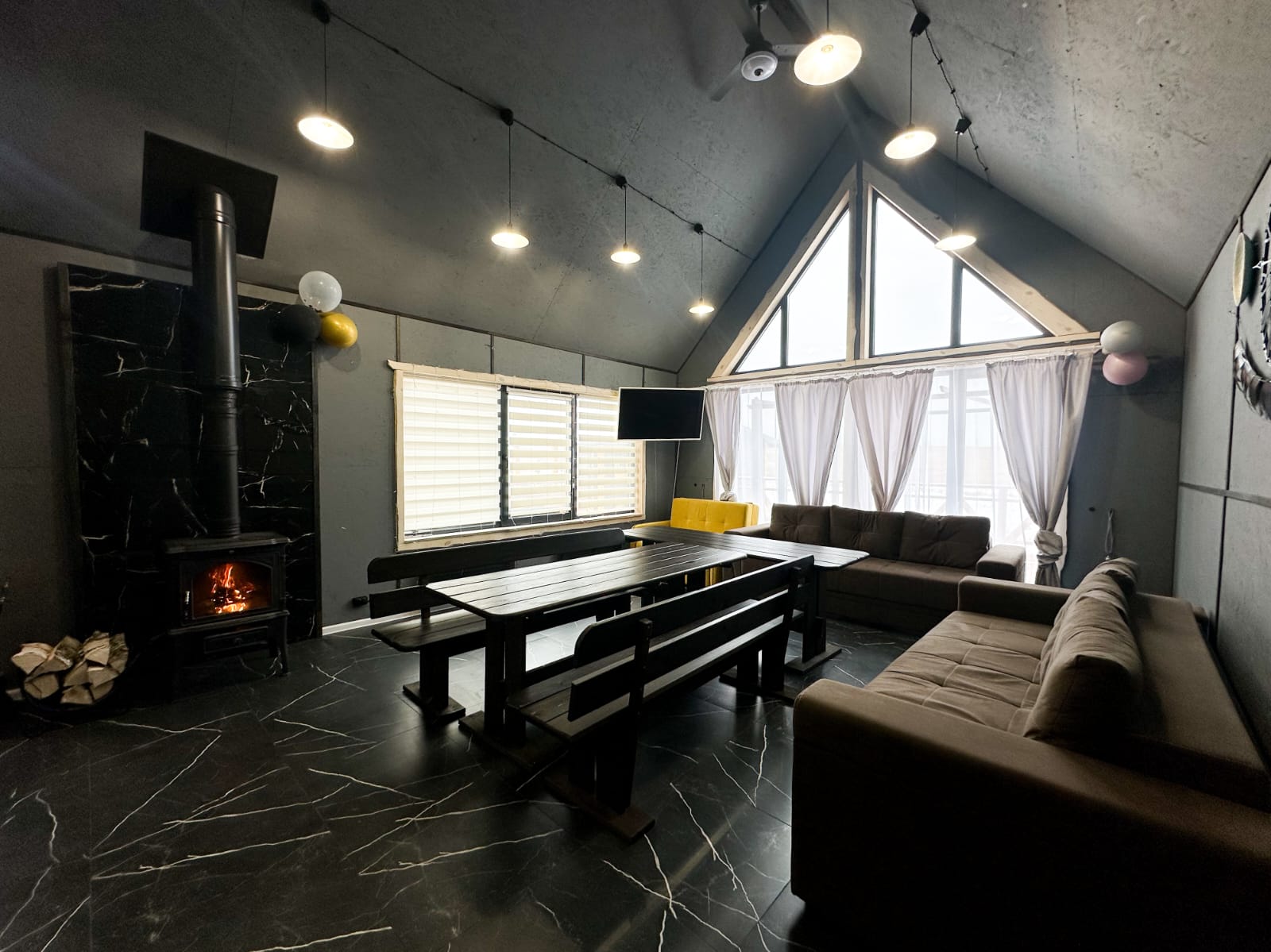 В доме теплый пол, большое панорамное окно, блэкаут шторы. Также есть проектор, подключен WI-FI. Большая кровать на первом этаже и еще одна двухспальная кровать на втором ярусе с ортопедическим матрасом и постельным премиум-класса. Для гостей в доме приготовили настольные игры.