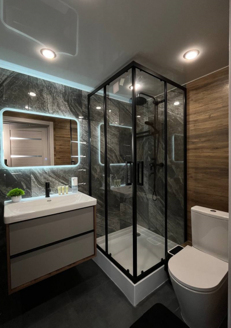 В санузле – зеркало с подсветкой, электрический полотенцесушитель, фен, душевая кабина. «Акватория» выдает гостям полотенца, халаты, одноразовые тапочки, а также необходимые предметы гигиены – жидкое мыло, ватные диски и палочки, туалетную бумагу.У глэмпинга распологается зона бассейнов с подогревом (большая чаша 25м и малая чаша 12м) и шезлонги с баром. Для проживающих в глэмпинге купание в бассейнах и отдых у воды – бесплатно.