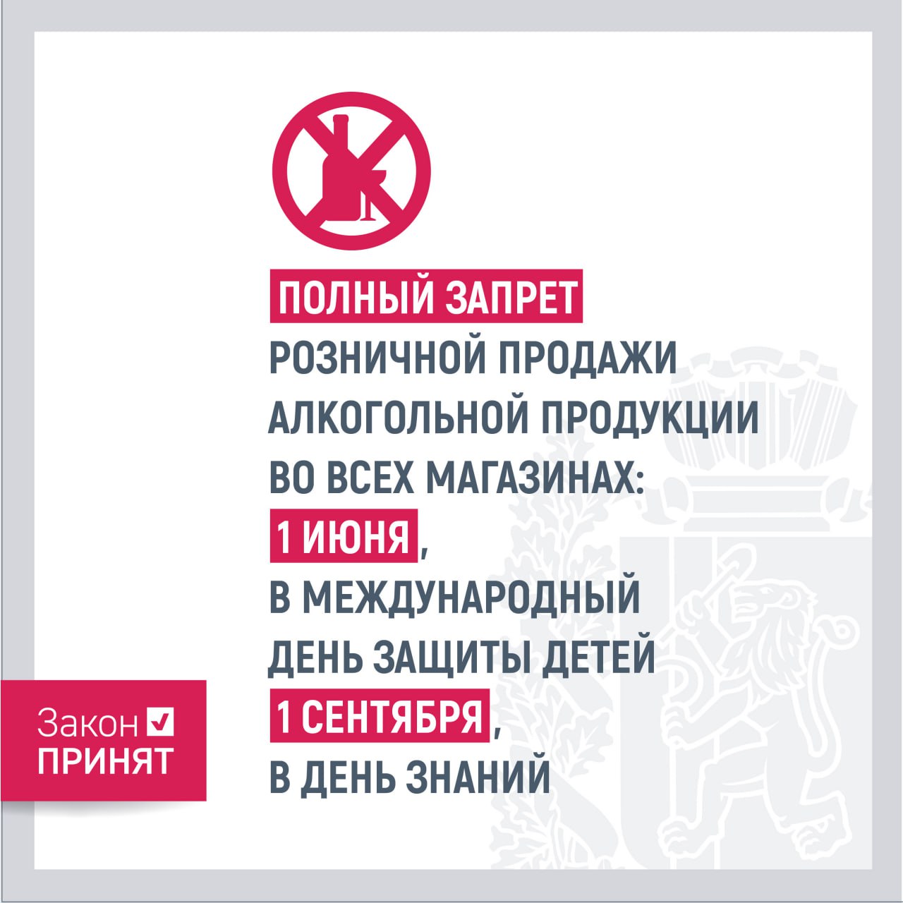 Полный запрет введут в Международный день защиты детей 1 июня и в День знания 1 сентября. При этом если второй праздник выпадает на выходной, то алкоголь не будут продавать на следующий за ним рабочий день. Ограничения на праздники будут действовать везде, кроме точек общепита.
