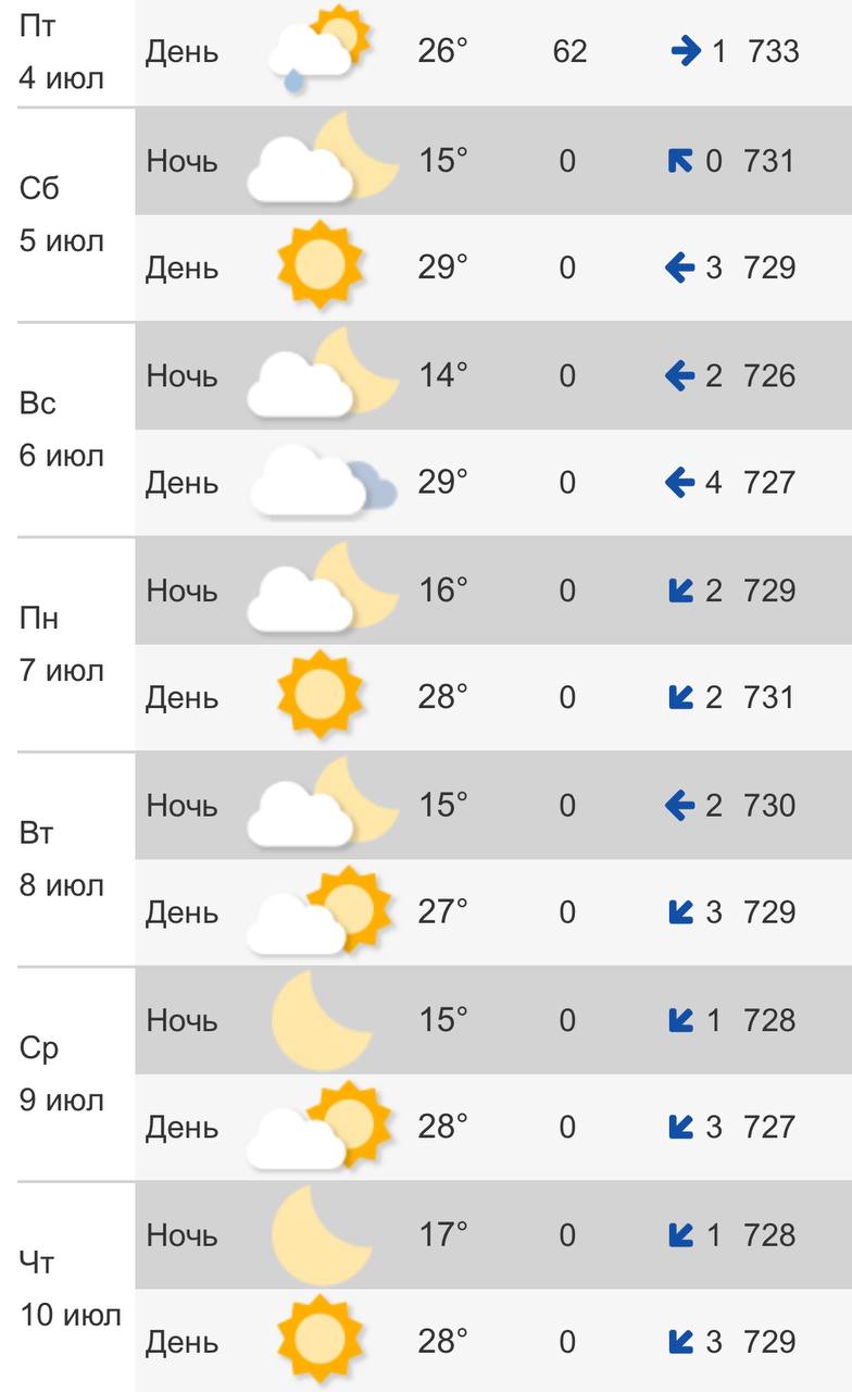 В воскресенье, 6 июля, будет также +29°С, но облачно – дождя не прогнозируют. Ветер восточный 4 м/с. К ночи похолодает до +16°С.
