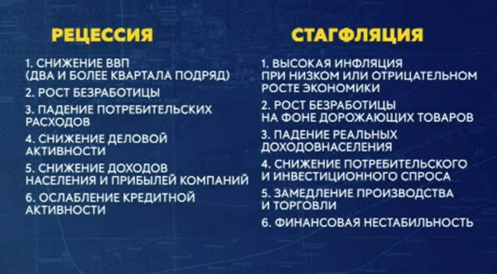 Рецессия – это устойчивое снижение экономической активности, которое длится несколько месяцев или дольше. Обычно это явление сопровождается снижением ключевых экономических показателей, например ВВП, доходов населения, темпов производства. Стагфляция же, как говорят экономисты, явление более опасное. В нем сочетаются отсутствие роста экономики и рост цен. При этом усугубить ситуацию могут как меры стимулирования экономики, так и методы борьбы с инфляцией. Стагфляцию считают одним из самых сложных сценариев для экономики.