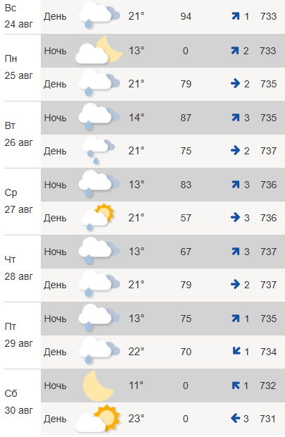 В среду, 27 августа, синоптики вновь обещают +21°, облачно с прояснениями и дожди. В четверг, 28 августа, ожидается до +21°C днем и до +13°C ночью.