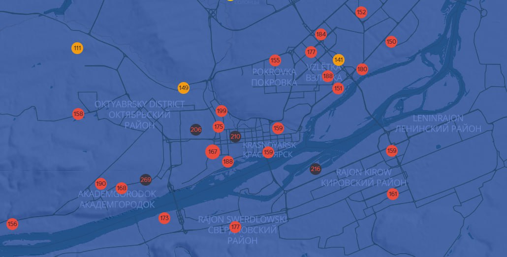 Судя по данным датчиков NeboLive, загрязнения воздуха фиксируют во всех районах. Карта общественников горит красным.