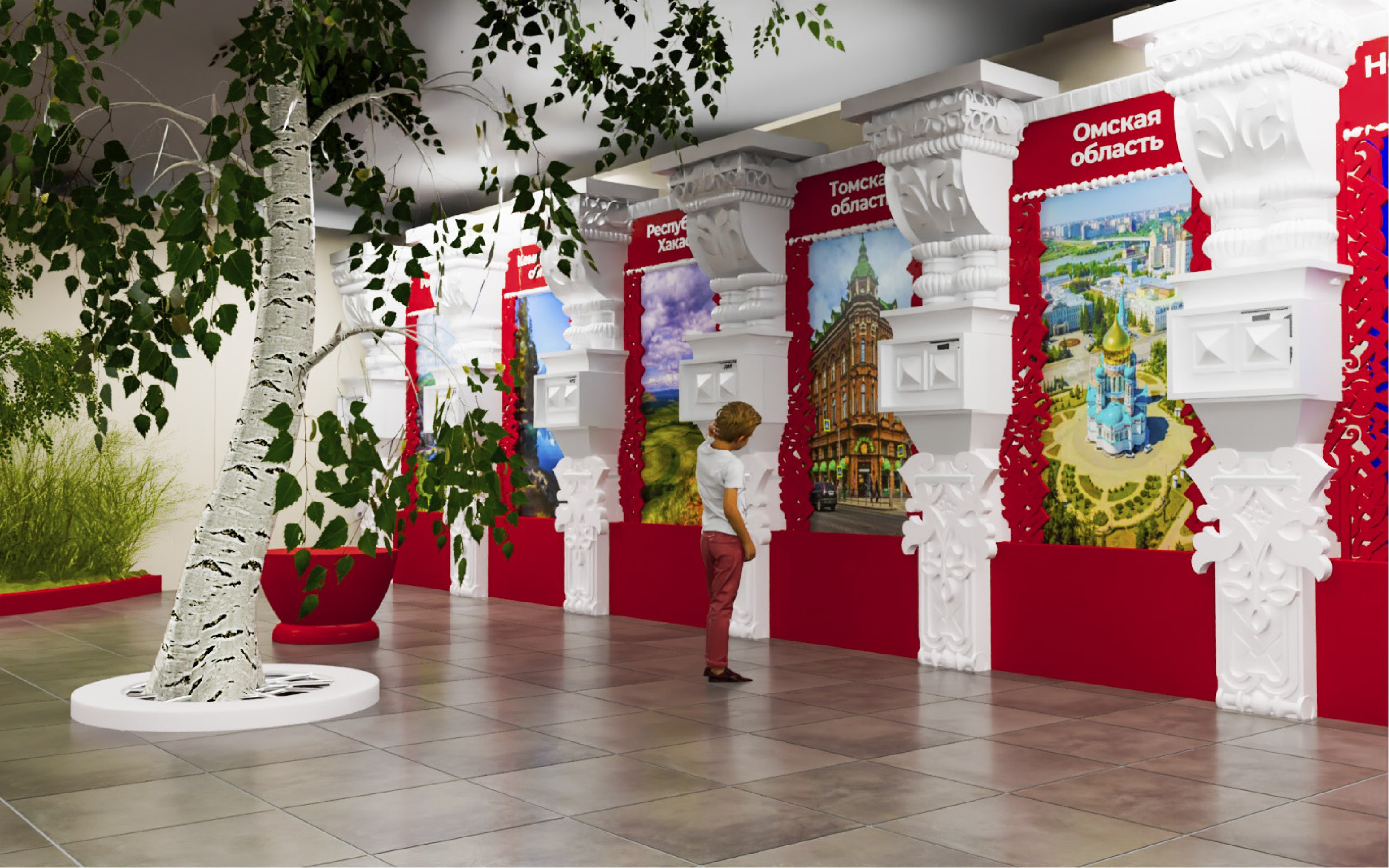 - Мультимедийный макет Красноярского края: Площадь – 30 кв. м. На физической карте с проекцией можно будет активировать разные слои, отображающие информацию об экономике, экологии и туристических маршрутах региона.