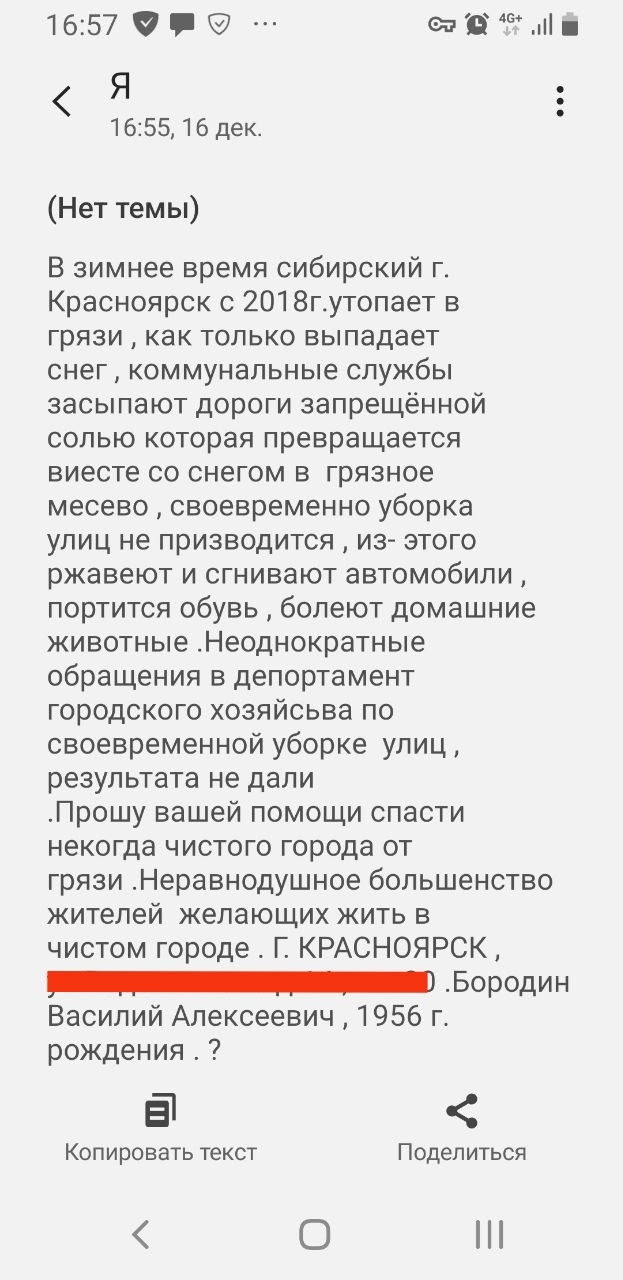 Координатор Красноярского регионального общественного движения автовладельцев Василий Бородин написал обращение на прямую линию президента России. Он попросил полностью запретить реагенты зимой в городе. Приводим его обращение полностью.