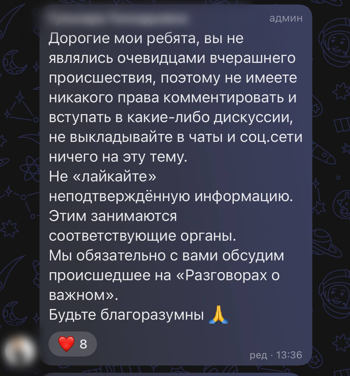 «Дорогие мои ребята, вы не являлись очевидцами вчерашнего происшествия, поэтому не имеете никакого права комментировать и вступать в какие-либо дискуссии, не выкладывайте в чаты и соц.сети ничего на эту тему. Не «лайкайте» неподтвержденную информацию. Этим занимаются соответствующие органы. Мы обязательно с вами обсудим происшедшее на «Разговорах о важном». Будьте благоразумны», – пишет один из классных руководителей.