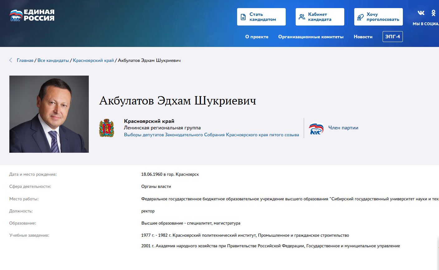 Отметим, Эдхам Акбулатов не занимался политикой последние 9 лет. С 2012 по 2017 год он был мэром Красноярска. Сейчас 66-летний Эдхам Акбулатов – ректор Университета Решетнева (СибГУ имени академика М.Ф. Решетнева).